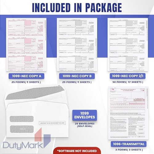 1099 NEC Forms 2025 for 25 Recipients 4 Part Laser Tax Forms Kit, 3 1096 Forms, 25 Security Self Seal Envelopes, Compatible with QuickBooks and Accounting Software, 2025 1099 NEC