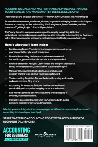Reviewed and approved by a team of 6 experienced accountants and CPAs, “Accounting for Beginners (All-in-One)” by Finance Knights Publications is exactly that: a practical, step-by-step guide that walks you through the core areas of modern accounting, from bookkeeping basics to investor analysis. By the end of this book, you’ll learn how to make and read financial statements, track and categorize transactions, apply the double-entry system, evaluate a company’s performance, and understand how accounting drives smarter business decisions, without the overwhelm.
