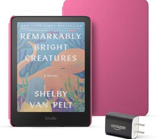 Amazon Kindle Colorsoft Essentials Bundle including Kindle Colorsoft (16 GB) – With color display – Black, Plant-Based Leather Cover-Raspberry and Power Adapter