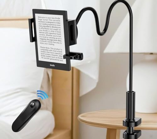 Kindle Holder with Remote Page Turner, Kindle Stand for Bed Reading, No Text Blocked 6mm Clip, No Margin Adjustments, Whisper-Quiet Page Turns, Fits 4.7-10″ Devices (Paperwhite/Oasis, iPad/iPhone)