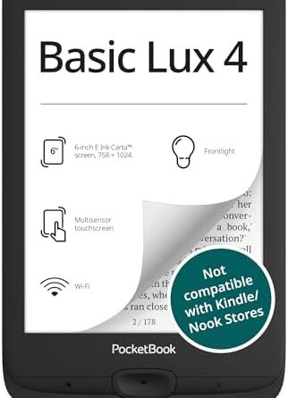 PocketBook Basic Lux 4 E-Book Reader – 6″ Glare-Free HD E-Ink Display – Frontlight – Compact & Lightweight Ebooks Reader – Wi-Fi, Ergonomic Buttons – MicroSD Slot – Eye-Friendly Ereader