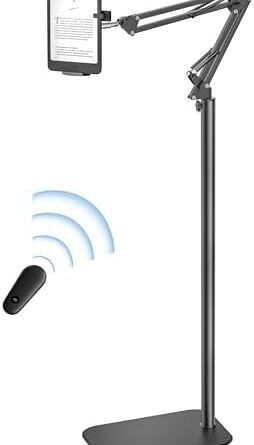 Floor Stand Kindle Holder with Remote Page Turner for Reading in Bed, Adjustable Tablet Mount with Clicker, Kindle Accessories Clicker Tablet Holder for Kindles Tablets iPhones 4.7-12.9 inch(Black)