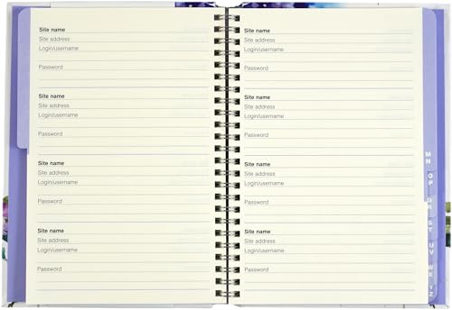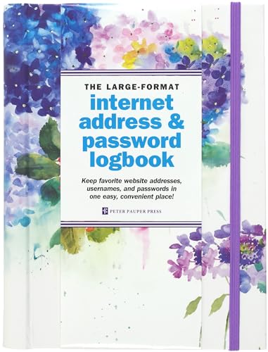 Lots of space — 144 pages, including tabbed alphabetical pages.Plenty of room for website addresses, usernames, passwords, and additional notes.Removable label helps you keep your information secure.A spiral binding that allows pages to lie flat for ease of use.Handy elastic band closure.Pages in the back in which to record additional useful information about your computer system and other notes.Our popular Hydrangeas design is reproduced on the cover of this logbook in luscious watercolor blues, pinks, greens, and purples.Gold foil highlights brighten the delicate flowers of this bouquet.Embossing adds dimensional detailing.An excellent companion to Peter Pauper Press’s other Hydrangeas stationery and gifts!Logbook makes an attractive but hardworking accessory for home or office.6-1/2 inches wide by 8-1/2 inches high.Covered wire-o binding.