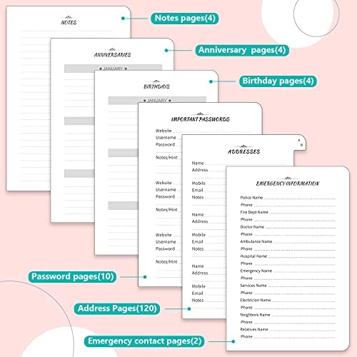 Super Functional and Ample space: 5.2 inches ×7.7 inches size telephone address & birthday book with 144 pages total. 3 entries per page and 30 entries per tab, total 360 entries for telephone & address, 10 pages with 30 entries for password, 4 pages 12- month birthday & important dates, 1 emergency contact page and 4 additional note pages for most important address so you can access them quickly.