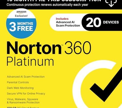 Norton 360 Platinum 2026 Ready, Antivirus software for 20 Devices with Auto-Renewal – 3 Months FREE – Includes Advanced AI Scam Protection, VPN, Dark Web Monitoring & PC Cloud Backup [Download]