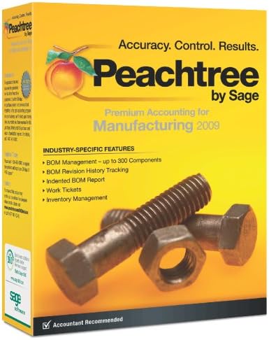 Peachtree by Sage Premium Accounting for Manufacturing 2009 provides advanced accounting features, manufacturing-specific features and reports, and analysis tools to help owners of small manufacturing companies improve their operations. It has a multi-user option* for improved productivity with screen-level security and a clear audit trail. Manufacturing features include enhanced BOM management, the ability to automatically generate purchase orders based on minimum stock levels and re-order quantities, the ability to create/track work tickets, serialized inventory tracking, and more than 140 customizable reports. Crystal Reports® 2008 is also included, giving manufacturers even greater operational analysis. Peachtree Premium Accounting for Manufacturing 2009 is the ideal choice for manufacturers.