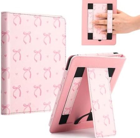 Pink Bow Case for 7″/ 6.8“ Kindle Paperwhite 12th/11th Generation,Hand Strap Stand Book Cover Sleeve for Kindle Colorsoft Signature Edition,2025 Cute Coquette Ereader Ebook Gifts
