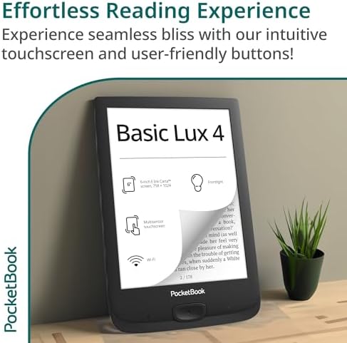 PocketBook Basic Lux 4 E-Book Reader – 6″ Glare-Free HD E-Ink Display – Frontlight – Compact & Lightweight Ebooks Reader – Wi-Fi, Ergonomic Buttons – MicroSD Slot – Eye-Friendly Ereader