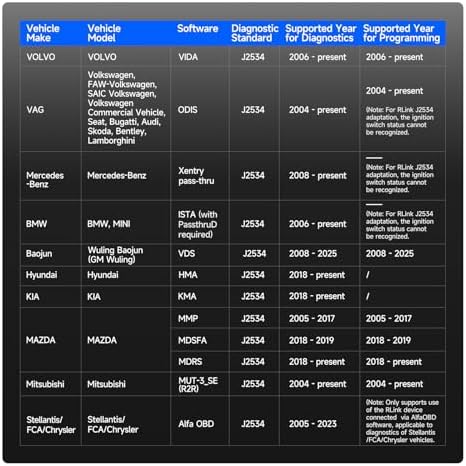 J2534 Pass-Thru Programmer: TOPDON RLink J2534 is an advanced diagnostic and reprogramming tool that support all J2534 protocols, as well as D-PDU, CAN-FD and DoIP, ensuring compatibility with a wide range of modern vehicles. It offers extensive versatility with support for over 18 major automotive brands, including Chrysler, Ford, GM, Nissan, Toyota, Honda, Subaru, Land Rover/Jaguar, Volvo, Wuling, Volkswagen/Audi, Mercedes-Benz, and BMW. NOTE: Not compatible with Ford IDS diagnostic software